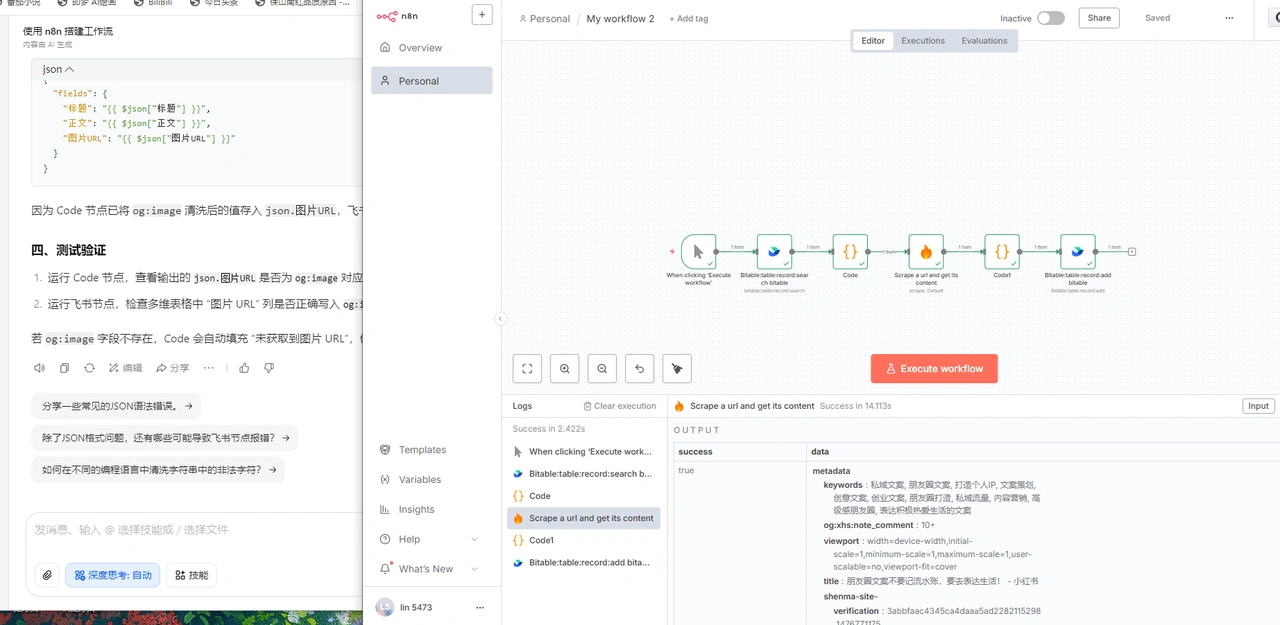 - 对n8n开始有基础了解,就开始想建立自己的小红书二创工作流,并按照豆包一步步的指导,花了8小时总算完成第一步小红书的采集