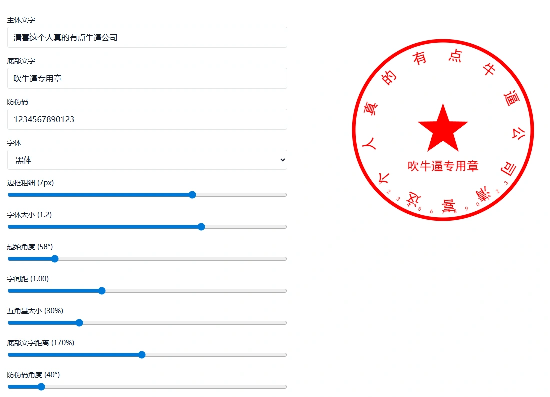 - 支持印章一键自定义生成,各种文字参数防伪码大小均可调节