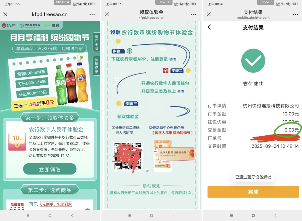 - 农行数币免费领四瓶可乐/雪碧/芬达+10-20立减金