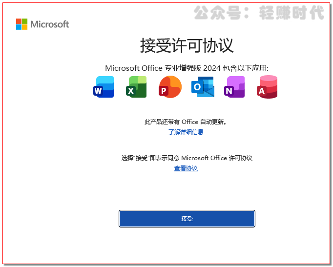 运行Office组件如Word,点击“接受”