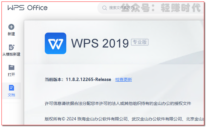 打开WPS组件如WPS 文字,显示版本,即可永久授权使用。